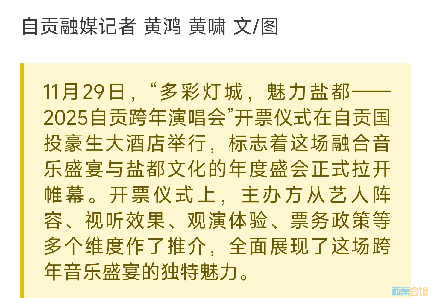 2025 年 11 月 29 日上午,由自贡市国有资本投资运营集团有限公司、自贡华荟文化产业发展有限公司主办的“多彩灯城 魅力盐都——2025 自贡跨年演唱会开票仪式”在自贡国投豪生大酒店隆重举行,标志着这场融合音乐盛宴与盐都文化的年度盛会正式拉开帷幕。开票仪式上,活动主办方对演唱会的核心亮点进行了系统而深入的发布,从艺人阵容、视听效果、观演体验到票务政策、商业合作等多个维度,全面展现了这场跨年音乐盛宴的独特魅力。