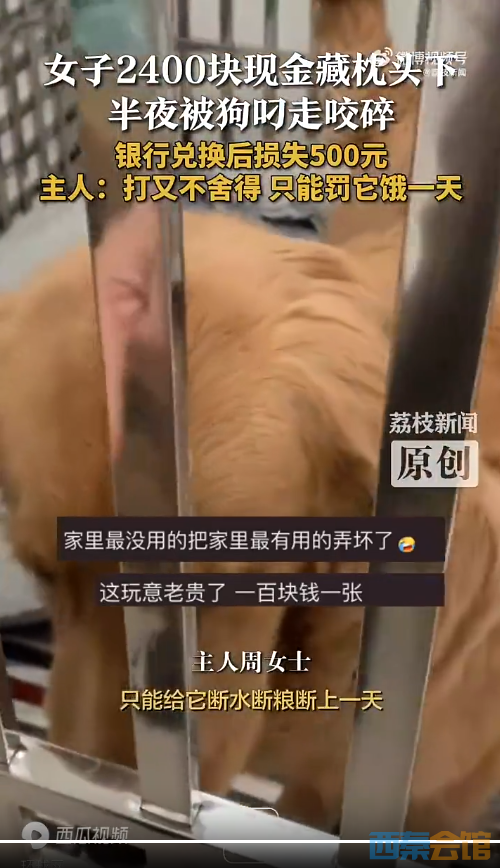 女子2400元现金藏枕头下,半夜被狗叼走咬碎!“打又舍不得,罚它饿一天”