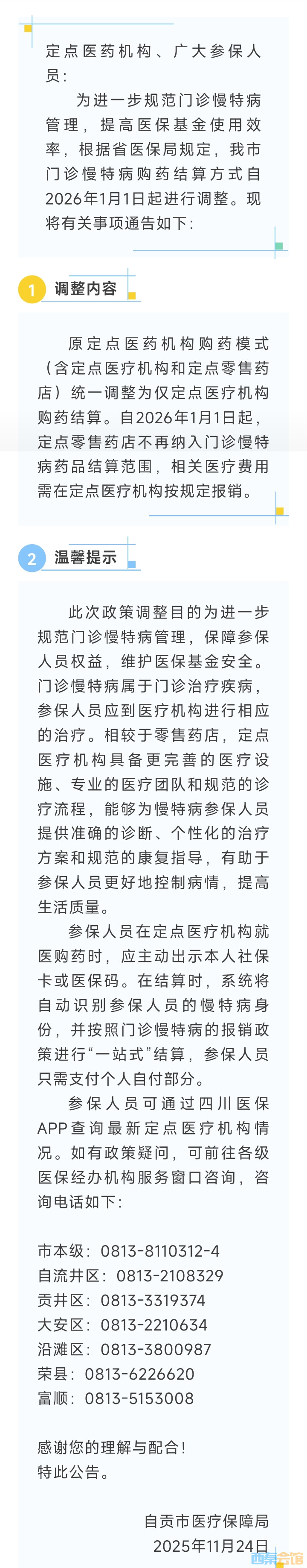 自贡市医疗保障局 关于调整冂诊慢特病购药结算方式的通告