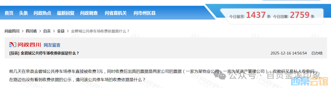 前几天在自贡荣县金碧城公共停车场停车直接被收费3元,同时收费后出具的票据是两家公司的票据(一家为某物业公司,一家为某资产管理公司),收款码又是私人收款码,在路边也没有看到收费依据的公示,请问该公共停车场的收费依据是什么?