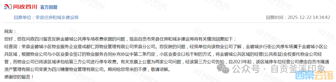 经查询:自贡荣县金碧城小区物业服务企业是成都仁邦物业管理有限公司荣县分公司。您反映的问题,经我单位向该物业公司了解,金碧城步行街公共停车场属于金碧城小区公共区域,根据物业公司与小区业委会签订的物业服务合同补充协议中第二条约定,小区业委会以包干制的方式,将金碧城公共区域的经营(公共收益)全权委托物业公司经营,而物业公司已将该区域承包给第三方公司进行停车收费。有关发票上公章为两家公司问题,经该第三方公司告知,自2023年起,该区域停车位经营公司便由自贡市隆通资产管理有限公司变更为四川精誉物业管理有限公司。期间给您带来的不便,敬请谅解。