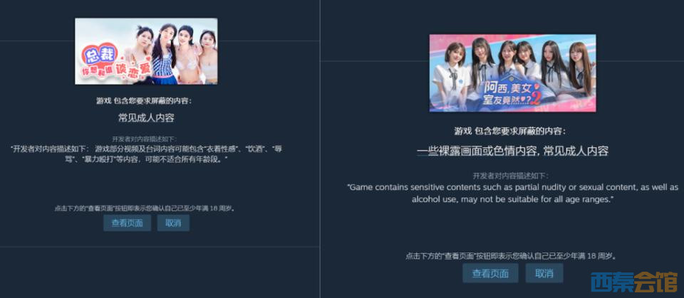 上述主播均表示这些游戏来自Steam平台。澎湃新闻实测发现,到Steam平台账号注册时,玩家需确认“已年满13周岁”。当玩家在商店偏好设置管理筛选“常见成人内容”与“裸露画面与色情内容”后,游戏下载前便会弹出开发者内容描述,并要求玩家确认已满18周岁。有些游戏需要输入用户的生日,但不要求上传证明。