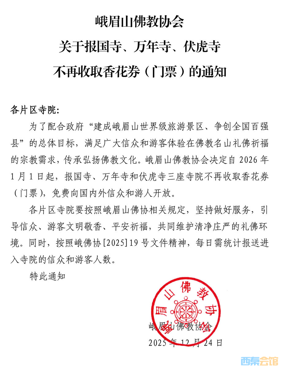 峨眉山全山寺院免费开放。