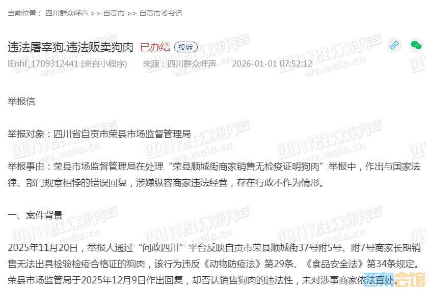 2025年11月20日,举报人通过“问政四川”平台反映自贡市荣县顺城街37号附5号、附7号商家长期销售无法出具检验检疫合格证的狗肉,该行为违反《动物防疫法》第29条、《食品安全法》第34条规定。荣县市场监管局于2025年12月9日作出回复,却否认销售狗肉的违法性,未对涉事商家依法查处。
