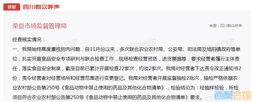 一、我局始终高度重视狗肉问题,自11月份以来,多次联合农业农村局、公安局、司法局及旭阳镇政府等单位,扎实开展食品安全专项研判与联合检查工作,现场检查经营资质,进货票据等,要求经营者履行主体责任,落实食品安全制度,截至目前已累计开展检查22家次,约谈2家次。我局对经营者下达责令改正通知书2份,责令经营者对经营场所和经营范围进行变更登记。我局对经营者开展监督抽检2批次,抽检严格依据农业农村部公告第250号《食品动物中禁止使用的药品及其他化合物清单》,检验结论为:经抽样检验,所检项目符合农业农村部公告第250号《食品动物中禁止使用的药品及其他化合物清单》要求。