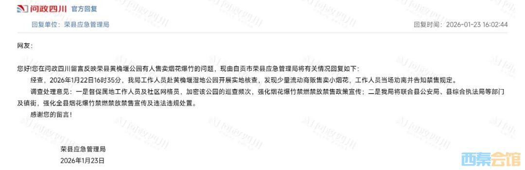 经查,2026年1月22日16时35分,我局工作人员赴黄桷堰湿地公园开展实地核查,发现少量流动商贩售卖小烟花,工作人员当场劝离并告知禁售规定。