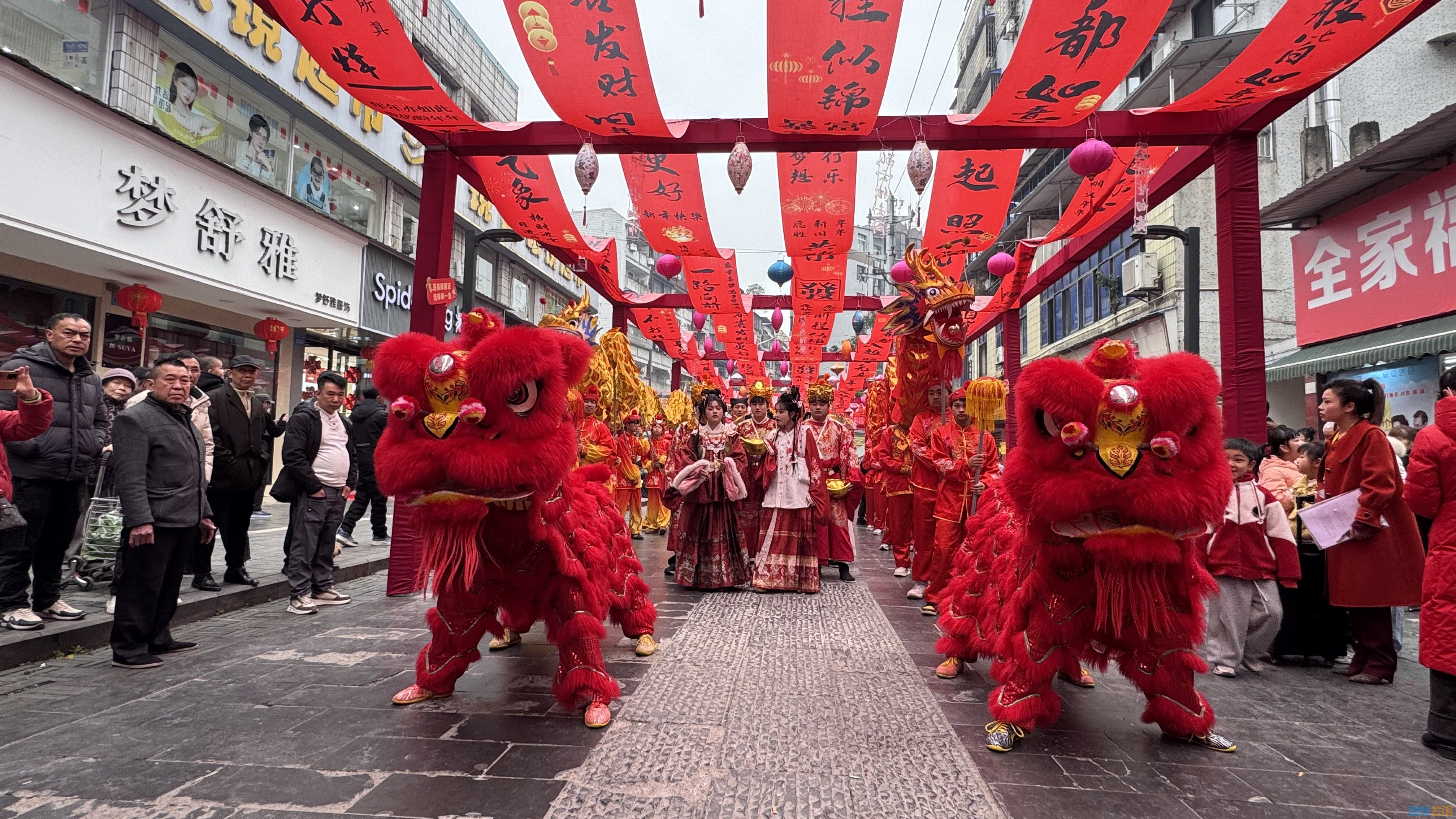 上午,巡游队伍从景区出发,瞬间点燃节日氛围。威风凛凛的舞龙舞狮腾跃翻转,金狮献瑞、祥龙贺岁,鼓乐齐鸣、气势恢宏;身着古风服饰的NPC列队巡游,衣袂飘飘、古韵盎然,与古色古香的街区相映成趣。巡游途中,川剧变脸绝活惊艳亮相,脸谱瞬息变换引得阵阵惊呼;活力满满的快闪舞蹈轻快灵动,将新春喜悦传递给每一位观众。市民游客纷纷驻足围观、拍照打卡,掌声、喝彩声此起彼伏,整条街道成为欢乐的海洋,尽显阖家团圆、其乐融融的节日景象。
