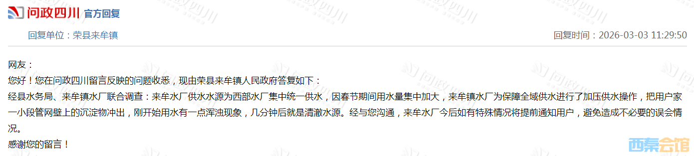 经县水务局、来牟镇水厂联合调查:来牟水厂供水水源为西部水厂集中统一供水,因春节期间用水量集中加大,来牟镇水厂为保障全域供水进行了加压供水操作,把用户家一小段管网壁上的沉淀物冲出,刚开始用水有一点浑浊现象,几分钟后就是清澈水源。经与您沟通,来牟水厂今后如有特殊情况将提前通知用户,避免造成不必要的误会情况。