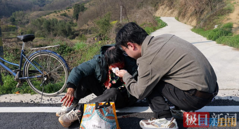 正在附近采访返程的记者,与磨市镇干部吴博文、陈洋,恰巧驾车途经现场。四人刚转过弯道,就看到了倒地的阿姨,也听到了她痛苦的呼救,没有丝毫犹豫,几人立刻停车冲了过去。吴博文快步蹲下身,轻声安抚:“阿姨,别慌!我们来帮你!” 话音未落,他转身跑回车里拿来纸巾,小心翼翼地擦拭阿姨满脸的血迹。一张又一张纸巾被鲜血浸透,他的动作却始终轻柔,生怕碰疼了老人。