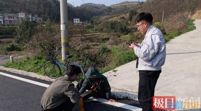 一分钟后,几位村干部也驱车赶到了现场。他们一到就来到阿姨身边,仔细查看伤情。“放心,我们守着你!” 村干部一边缓解阿姨的恐惧与痛苦,一边立刻联系她远在武汉的儿子,详细告知现场救援进展和阿姨的伤情,反复叮嘱“我们一直在现场,救护车马上就到,你别着急”。同时,他们还在一旁维持现场秩序,疏散围观的村民,防止过往车辆造成二次伤害,并细心地将阿姨摔倒的自行车,推到一旁农户家中妥善存放,避免车辆丢失或造成交通隐患。