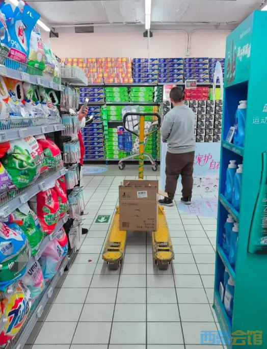 2月27日早上8点多,记者一进超市便听到上货车车轮碾轧地板的轰隆声,以及碾过地砖缝隙的咯噔声。记者观察发现,该家超市的地面铺设材料不一,主要通道是缝隙较小的大块地板砖,而货架之间的地面则由一块块小方砖铺成,这些小方砖间拼缝较宽较深,坚硬的车轮一碾过就会发出较大的声响。记者的背后传来一阵轰隆声,回头看见一名员工正拉着几箱饮料到货架前补货。