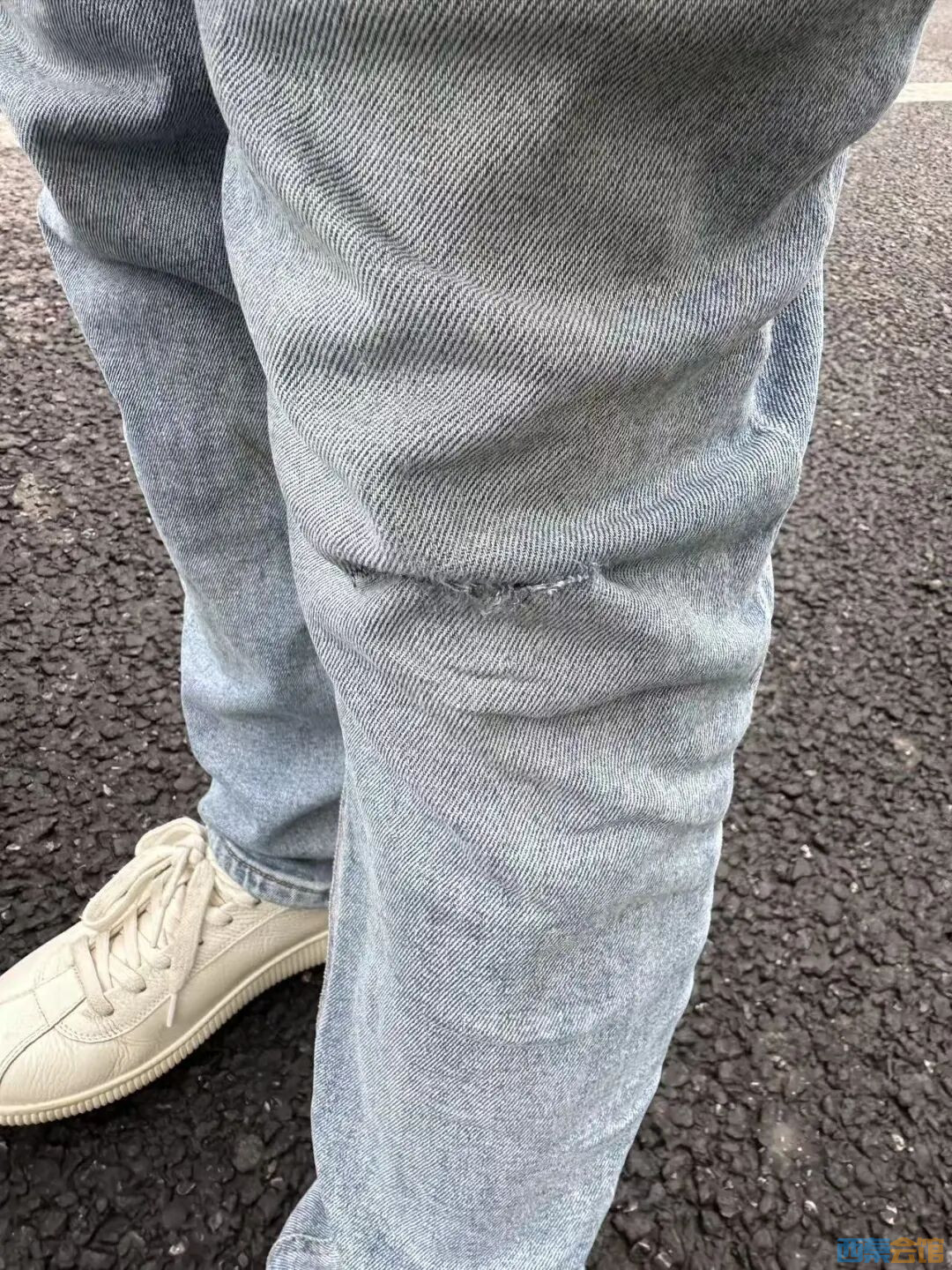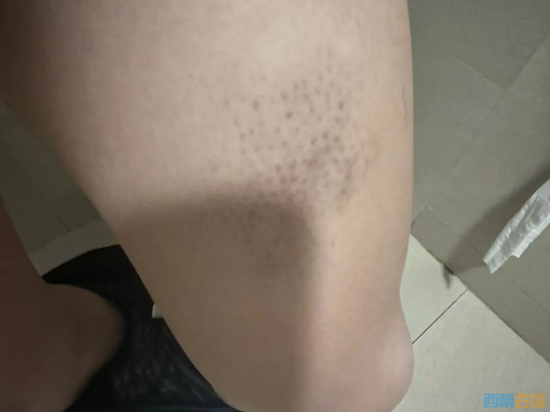 根据赵先生提供的照片,其左大腿前侧和右大腿内侧均出现明显淤青,裤子膝盖处破损,手机屏幕也碎裂出现多条裂纹。